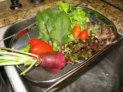 I made a tasty salad from the garden... radish, pepper, spinach, lettuce, and tomato. Mmmm!